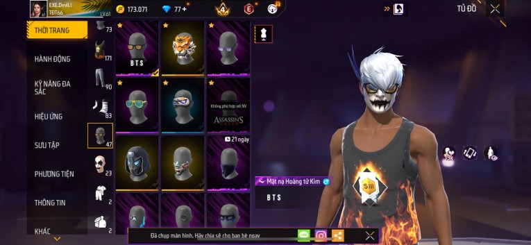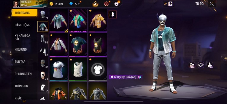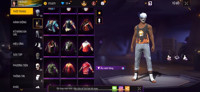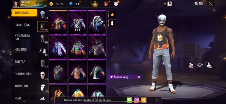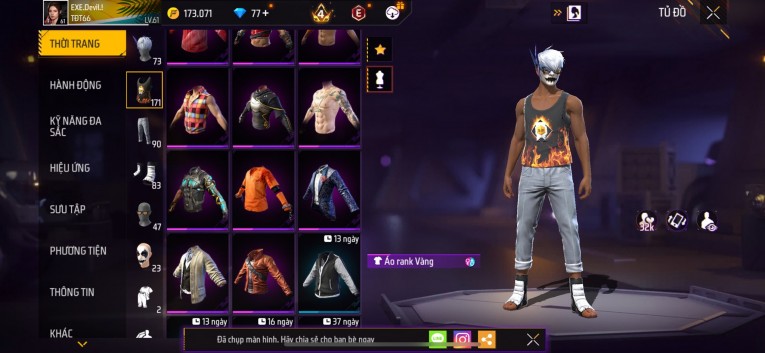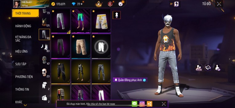 Acc chơi lâu, nhiều skin súng xịn, đầy đủ áo và phụ kiện nam. Đồ đủ dùng, đẹp mắt – vào chơi là chiến ngay!
