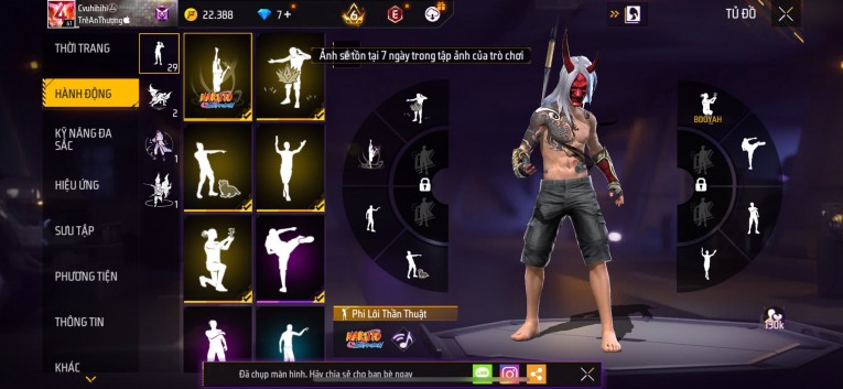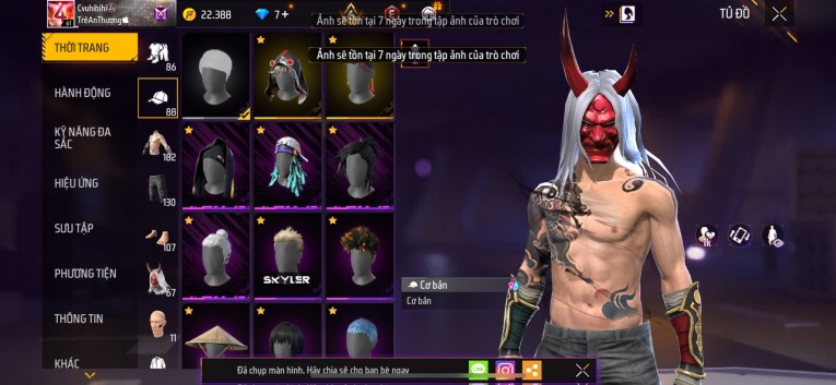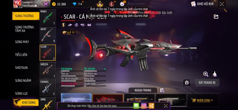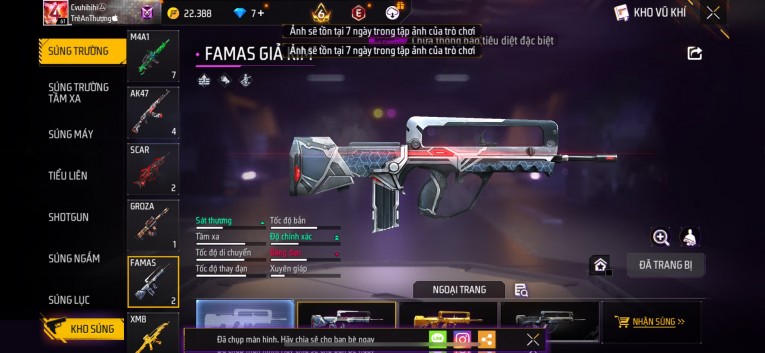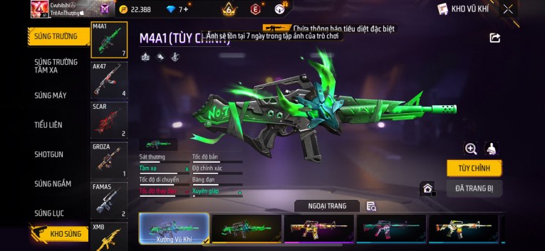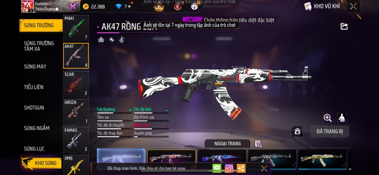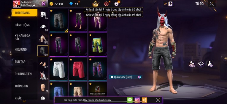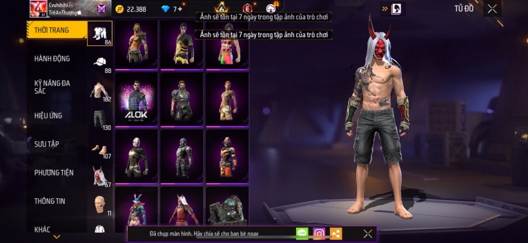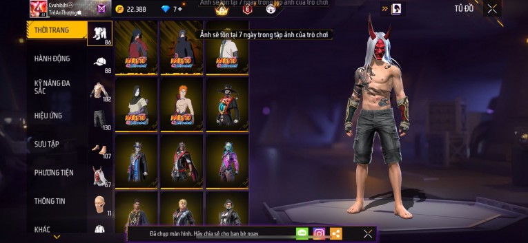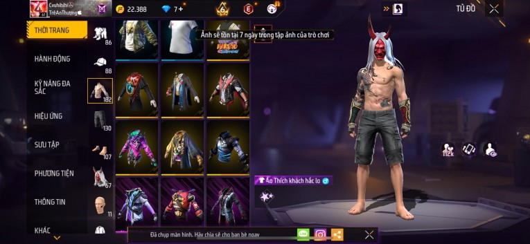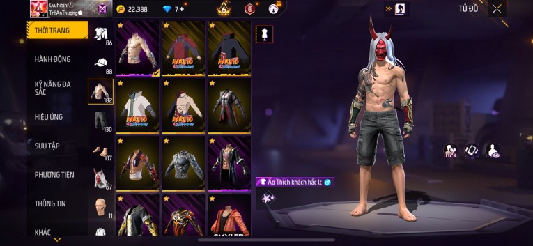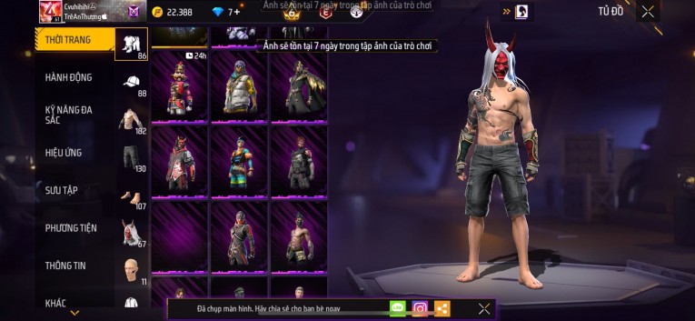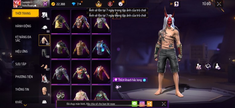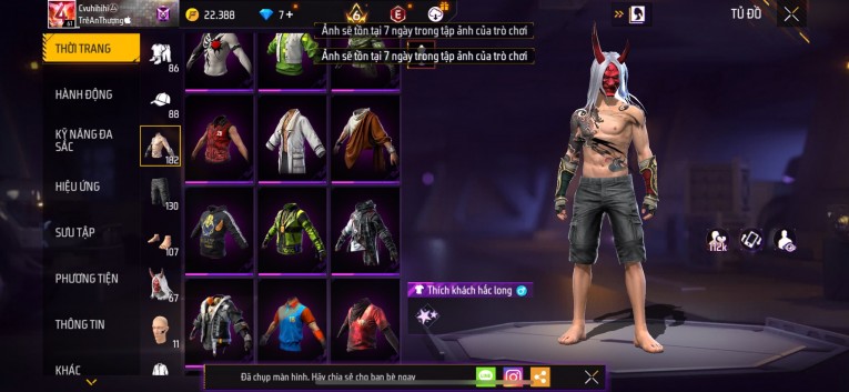 Acc chơi lâu, nhiều skin súng xịn, đầy đủ áo và phụ kiện nam. Đồ đủ dùng, đẹp mắt – vào chơi là chiến ngay! Phù hợp anh em thích skin đẹp, súng mạnh, acc ổn định.
