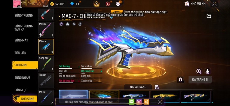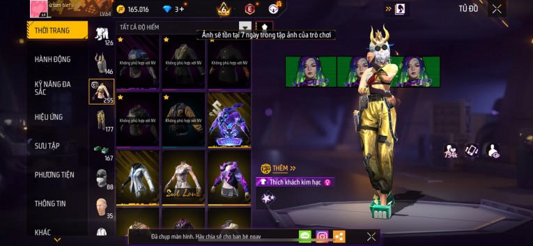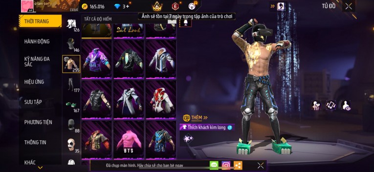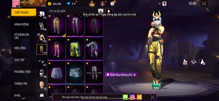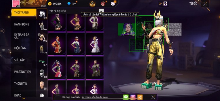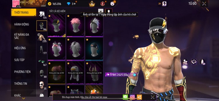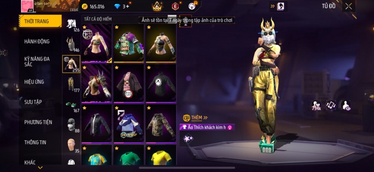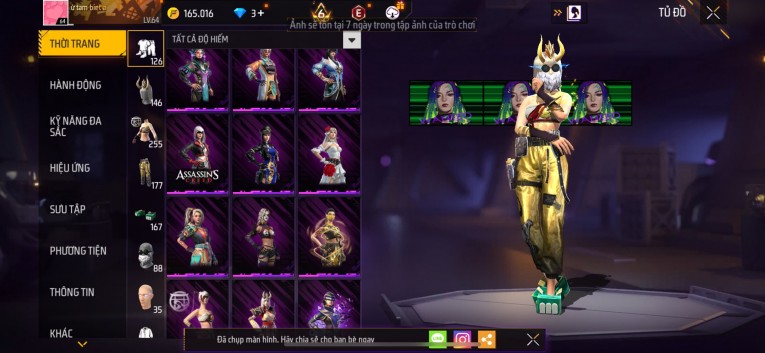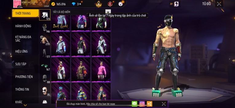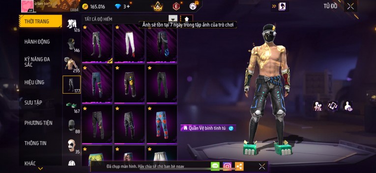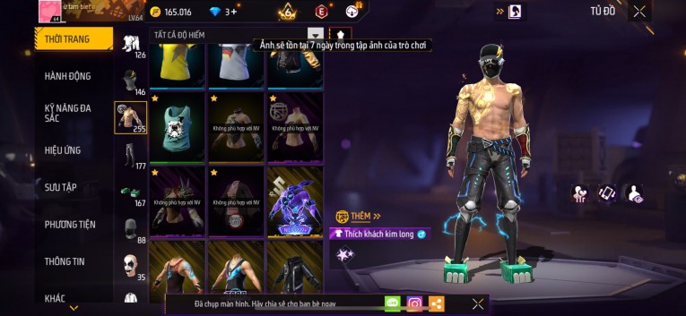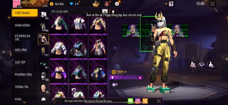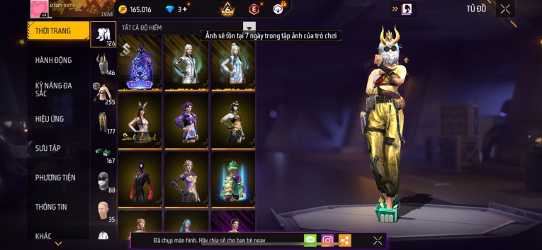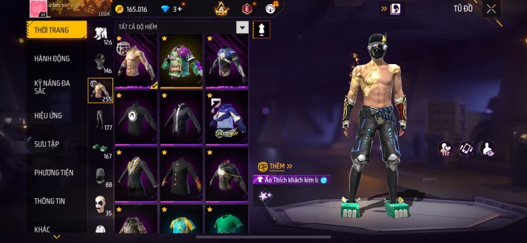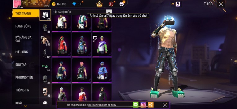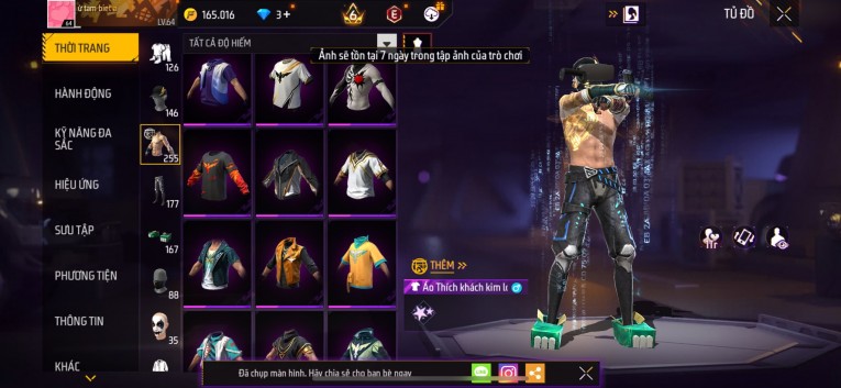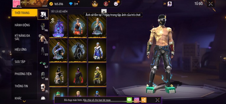 Acc chơi lâu, nhiều skin súng xịn, đầy đủ áo và phụ kiện nam. Đồ đủ dùng, đẹp mắt – vào chơi là chiến ngay! Phù hợp anh em thích skin đẹp, súng mạnh, acc ổn định.