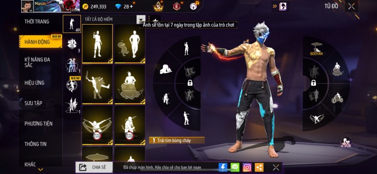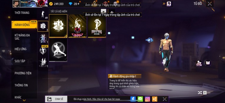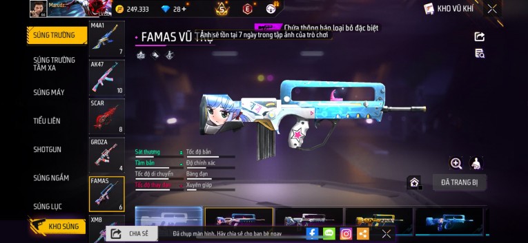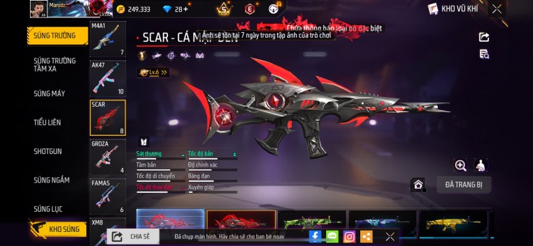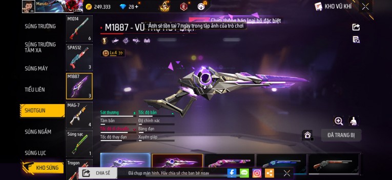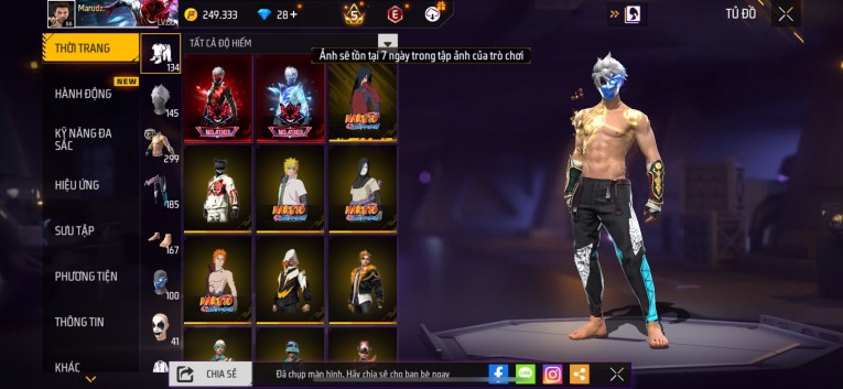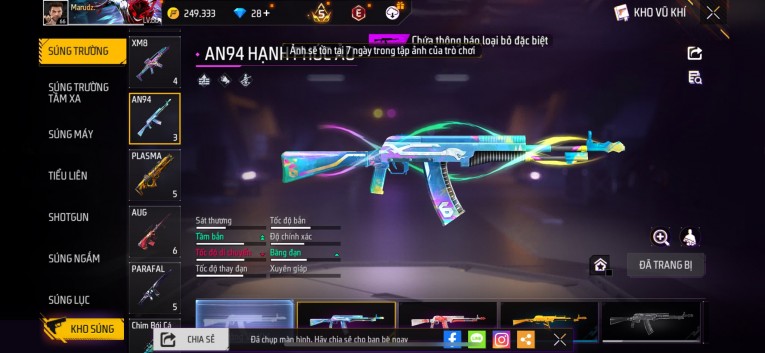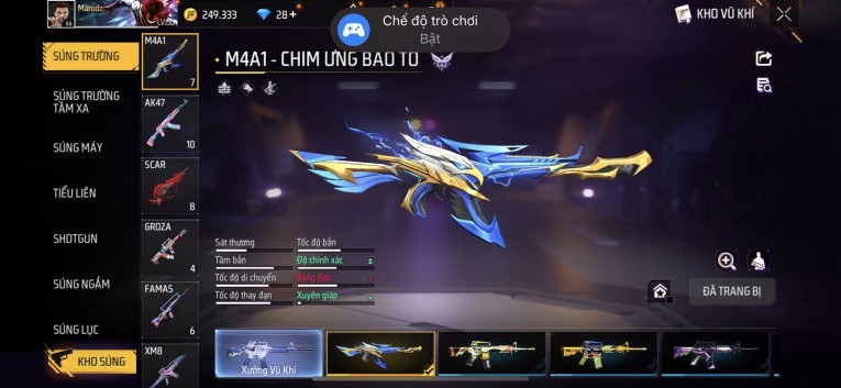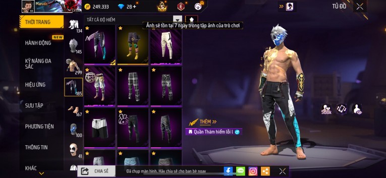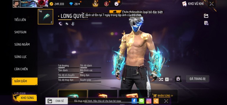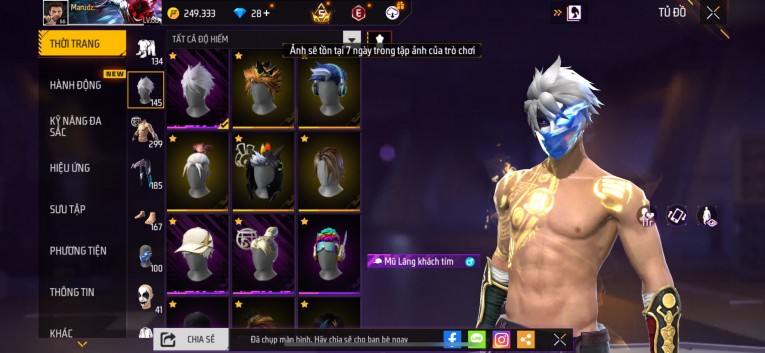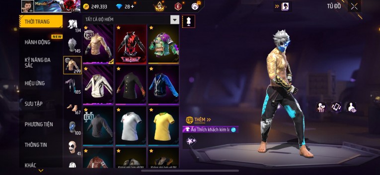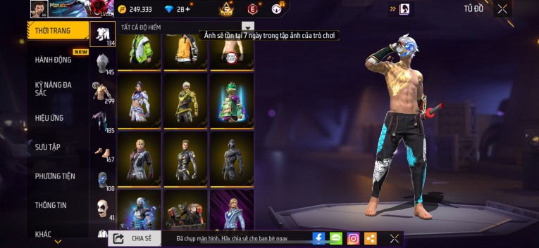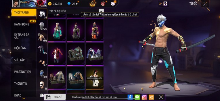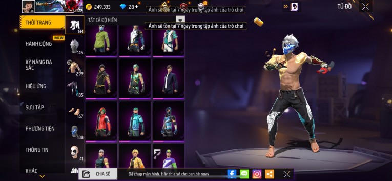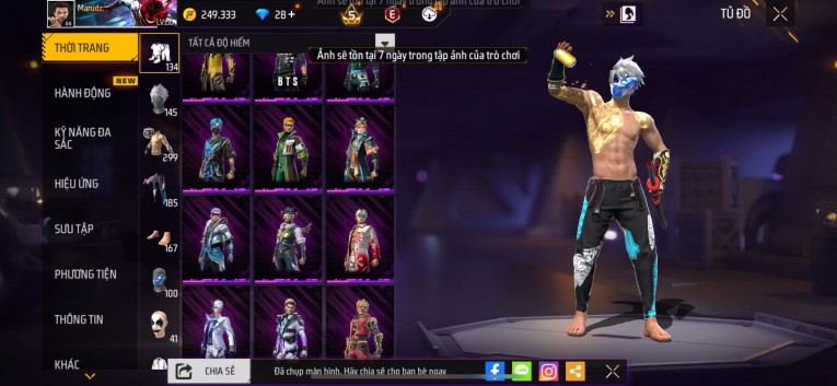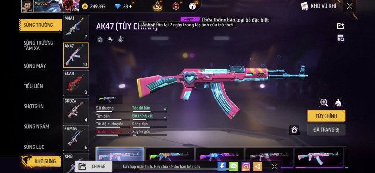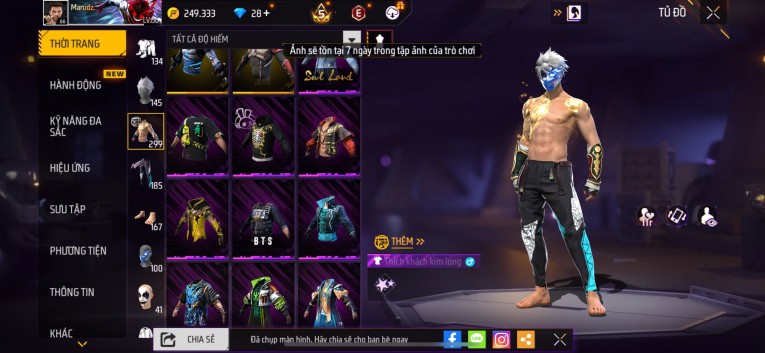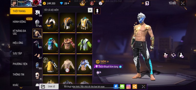 nổi bật: Acc chơi lâu, nhiều skin súng xịn, đầy đủ áo và phụ kiện nam. Đồ đủ dùng, đẹp mắt – vào chơi là chiến ngay! Phù hợp anh em thích skin đẹp, súng mạnh, acc ổn định.